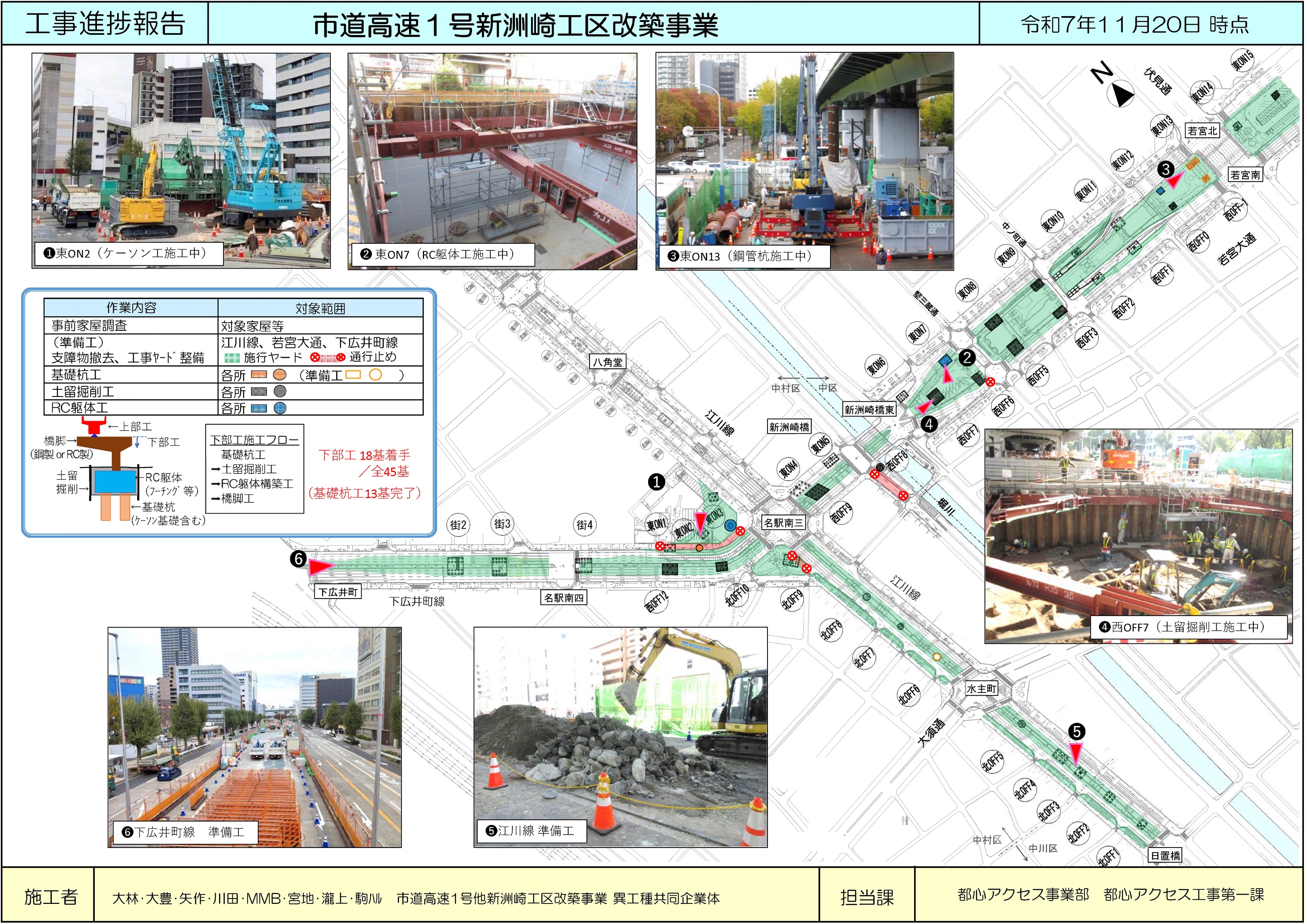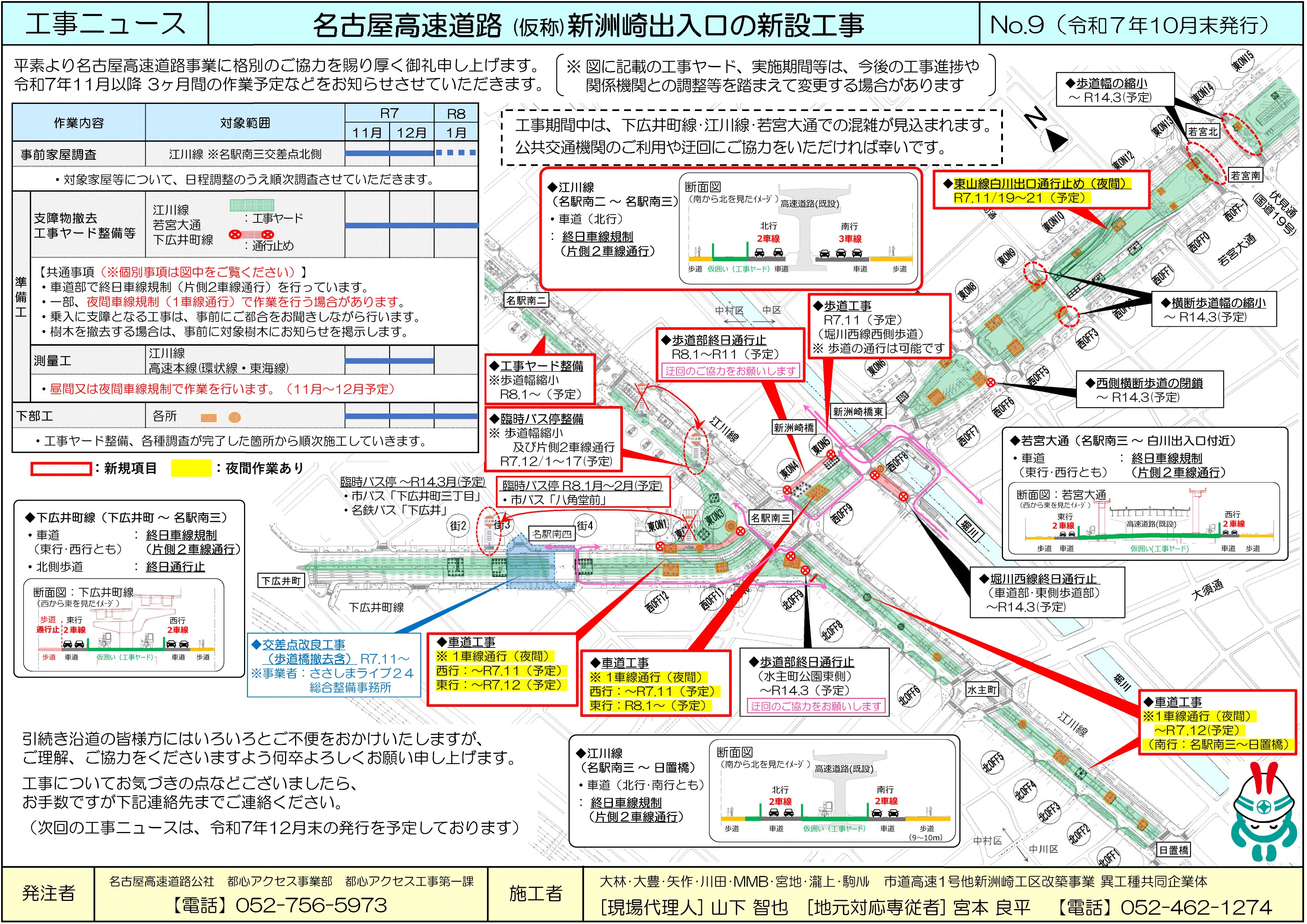 名古屋高速道路公社では、都心へのアクセスの向上等を図るため、出入口の新設等、都心アクセス事業に取り組んでおります。このうち、(仮称)新洲崎出入口については、2031年度の完成を目標に、工事に必要な工事ヤードを確保するため、一般道において終日車線規制などの交通規制を実施しております。