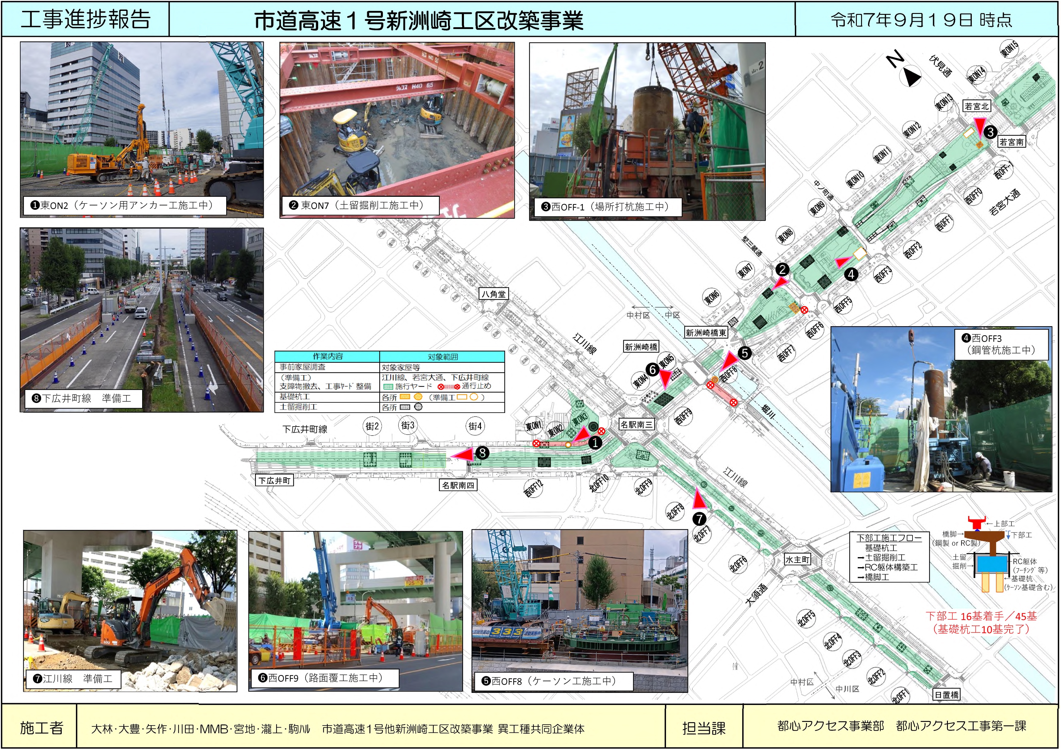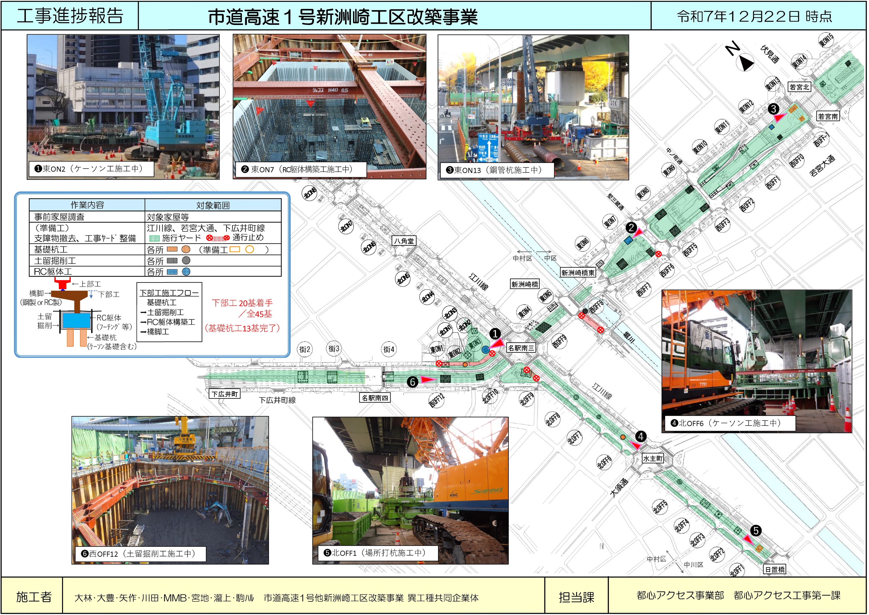 名古屋高速道路公社では、都心へのアクセスの向上等を図るため、出入口の新設等、都心アクセス事業に取り組んでおります。このうち、(仮称)新洲崎出入口については、2031年度の完成を目標に、工事に必要な工事ヤードを確保するため、一般道において終日車線規制などの交通規制を実施しております。