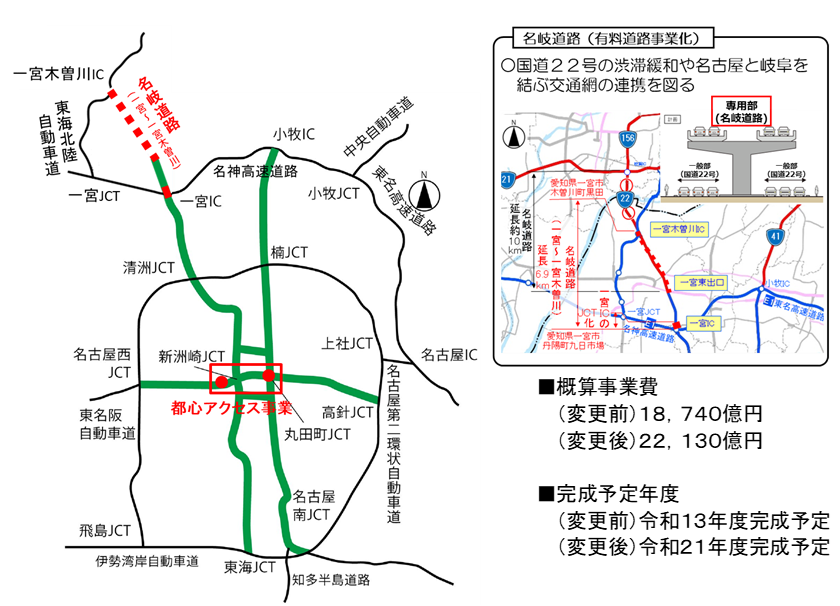 名古屋高速道路公社では、2025年(令和7年)4月に国土交通省により事業化された名岐道路(一宮~一宮木曽川)の有料道路事業化と都心アクセス事業における事業費と完成予定年度を変更しました。(2026年(令和8年)1月9日国土交通大臣許可)