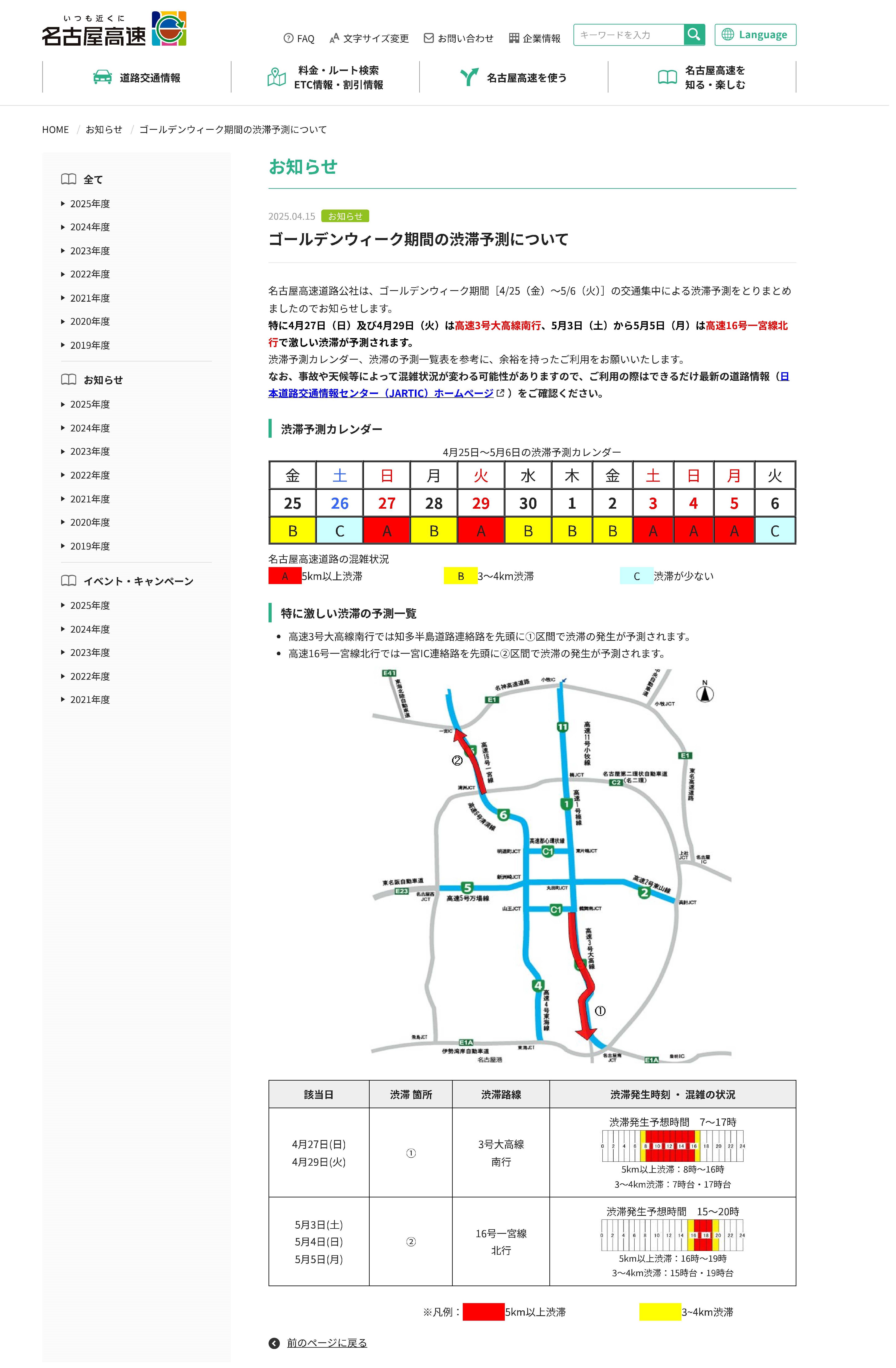大型連休中に快適なドライブをしていただけるよう、GWやお盆、年末における昨年の交通状況をホームページで事前にお知らせし、渋滞区間や渋滞が発生しやすい時間帯を避けたご利用をお客様へ呼びかけています。
