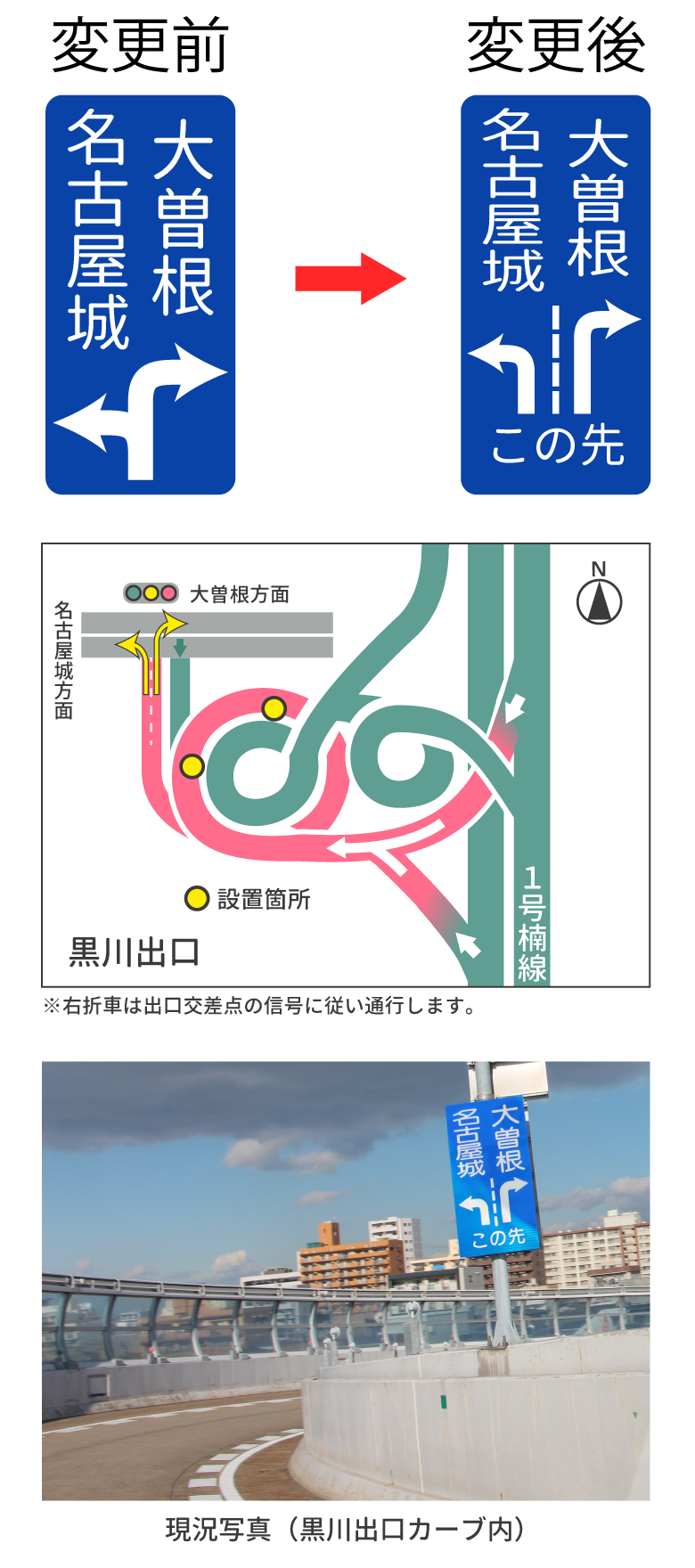黒川出口の交差点手前が右左折で2車線に分岐しているが、カーブしていて事前に分かりづらい。 そのため、左折したくても右折車の信号待ちに巻き込まれてしまう。 交差点の手前から2車線に分岐していることを案内してほしい。